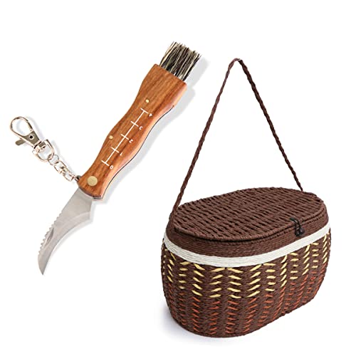 Flanacom [FÖRBättta] Uppsättning av 2 svampknivar med svampkorg – knivar med borste/borste och linjal för att fälla upp rostfritt stål + vinkorg för att samla svampar – (kniv + korg)