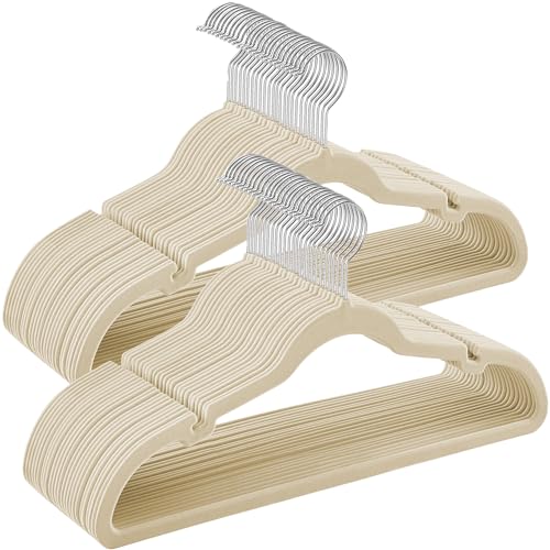 SONGMICS Sammetshängare, set med 50, halkfria, med skåra, byxstång, 360° svängbar krok, utrymmesbesparande, tjocklek 0,6 cm, längd 43 cm, beige sand CRF029K05