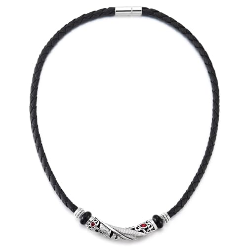 COOLSTEELANDBEYOND Svart flätat läderhalsband med fjäderhänge och röda stenar - vintage stam - dam herr, Svart läder och syntetisk svart onyx, Ingen ädelsten