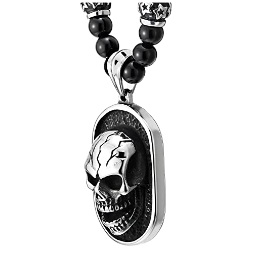 COOLSTEELANDBEYOND gotisk stil män svart onyx-pärlhalsband, rostfritt stål svärtad hund etikett hänge med dödskalle, Syntetisk svart onyx, Ingen ädelsten