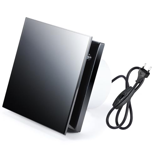 Byxor Vary svart glasplatta badrumsfläkt 100 mm, tyst frånluftsfläkt 10 W 95 m³/h fönsterfläkt frånluft med ryckluff, fönstermonteringsring, EU-kontakt för kök toalett, badrum