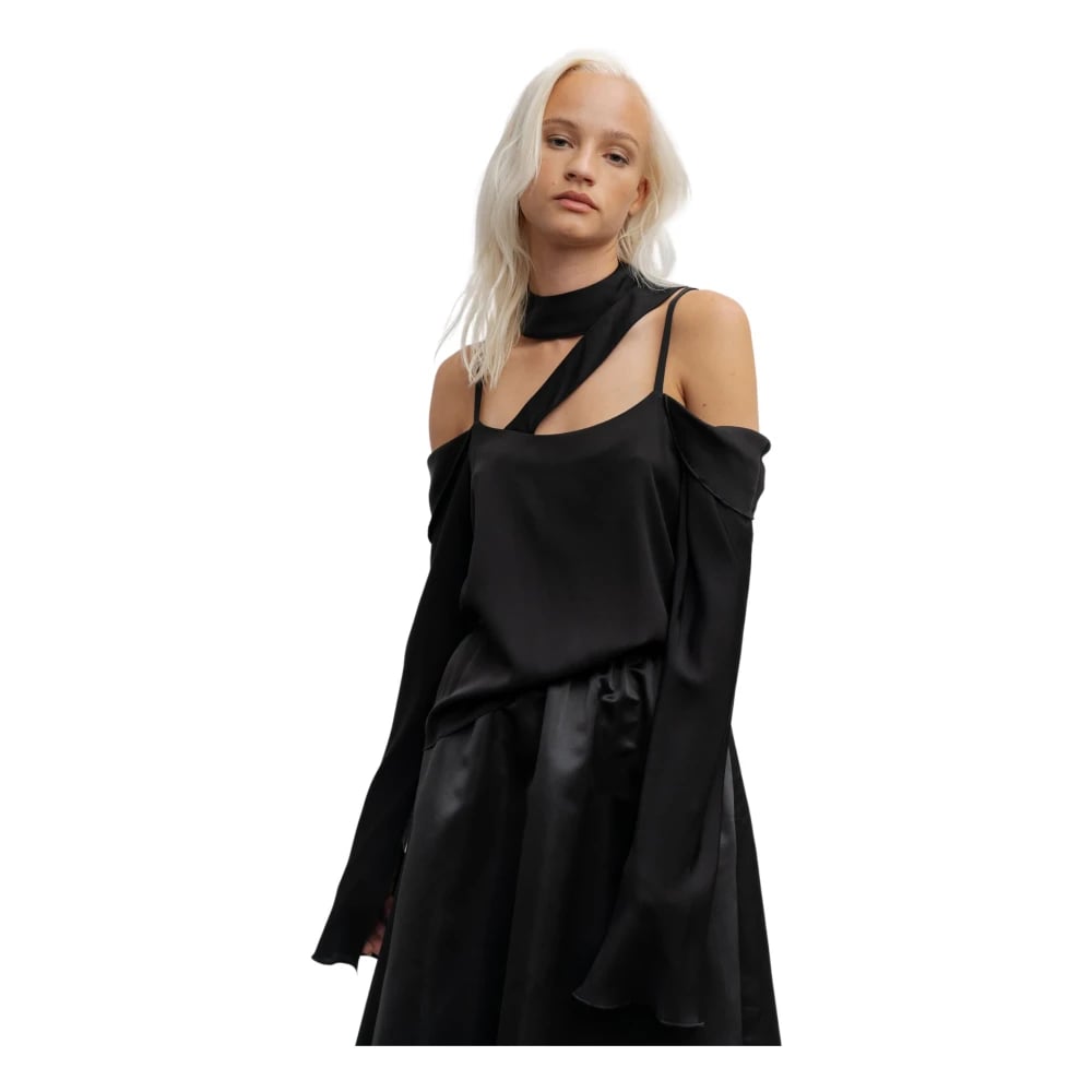 P.a.r.o.s.h., Blusar & Skjortor , Dam, M, Polyester, Svart blus med droppade axlar och nyckelhålsdetalj