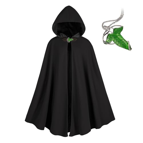 NFAOEGJ medeltida kostym kappa med huva, män renässans huva cape med grönt blad brosch halsband, för halloween cosplay utklädning (svart)