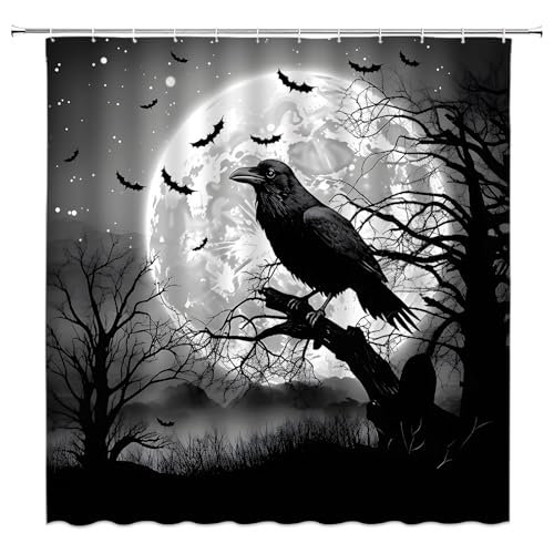 AEMBEE Halloween duschdraperi svart kråka fladdermöss i läskig fullmåne natt gotisk blod skräck skrämmande läskigt mystiskt tyg dekorativa badrumsgardiner med krokar, grå svart