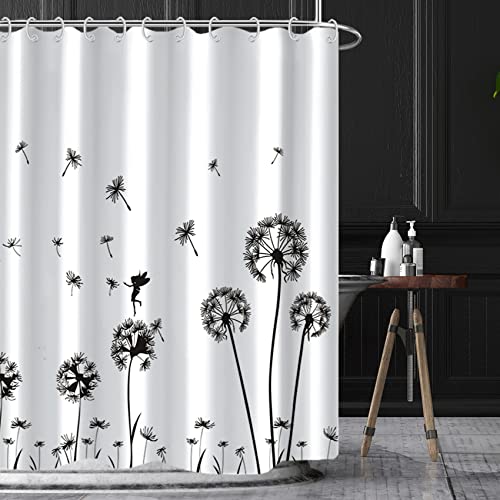 Bovlleetd maskros duschdraperi svart och vit enkel flygande maskros älva badrum gardin badrum blommig design med krok vattentät anpassningsbar konstgardin 180 x 200 cm