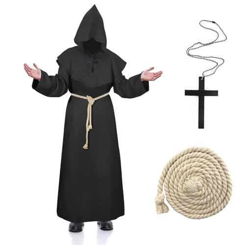 Hukermoon Renässans medeltida munk kostym, munk herr kostym medeltida munkkostym med huva och halsband München kostym halloween karneval cosplay (svart, L)