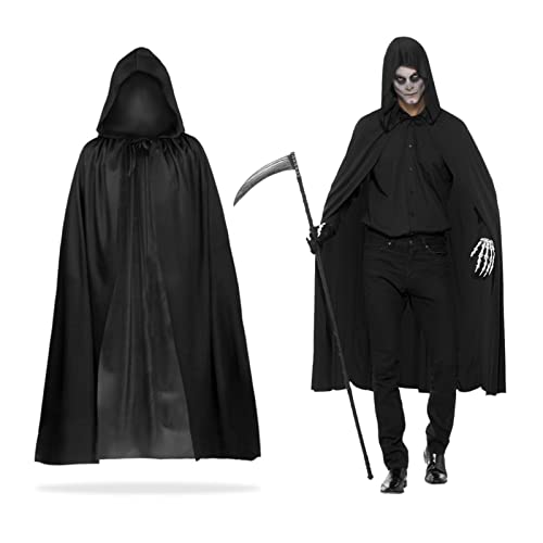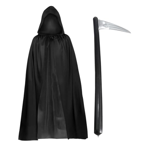 FUIPVGI liemannen-dräkt i 2 delar, 140 cm lång svart kappa med huva, uppblåsbar lie, mystiska skräck liemannen-dräkter för Halloween, för vuxna och barn (svart)