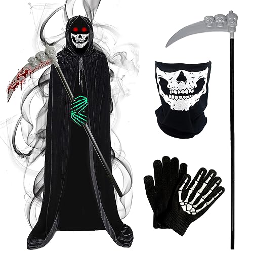 Hukermoon Liemannen-kostym, dräkt för halloween, kostymset av liemannen/Grim Reaper bestående av lie, handskar, dödskallemask och svart kappa med huva, för barn, halloweenfestdekoration, cosplay