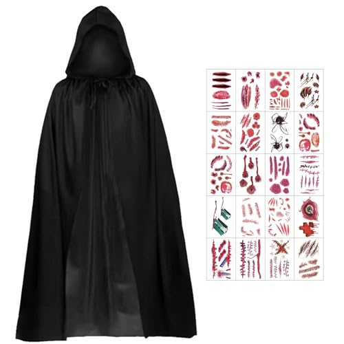 Qunkun Huva Cape, vampyrkostym, svart vampyr, kappa, lilja, skallmask, kostymer, set för vuxna, cosplay, kostym med 20 halloween, tillfälliga ärr, vattentät, terror, tatueringsklistermärken (90 cm)