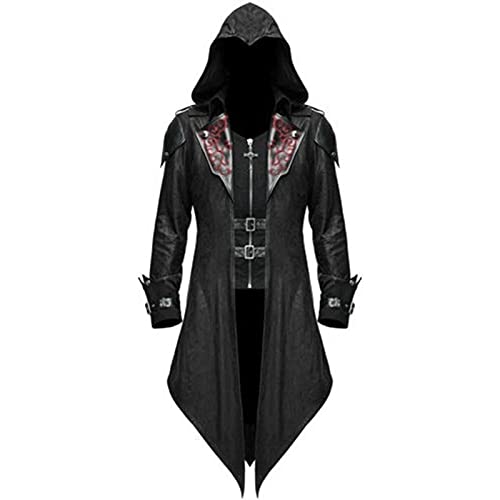 Jiumaocleu Trenchcoat för män gotisk kostym jacka med huva medeltida kappa viktoriansk svanskappa steampunk medeltida halloween maskerad retro skarvning kostym kappa S-5XL, Svart, L
