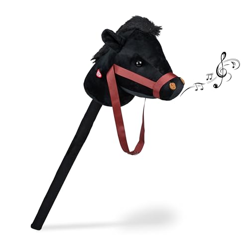 Relaxdays Käpphäst med ljud, barn, plysch och plast, höjd: 68 cm, söt käpphäst, stavhäst, svart
