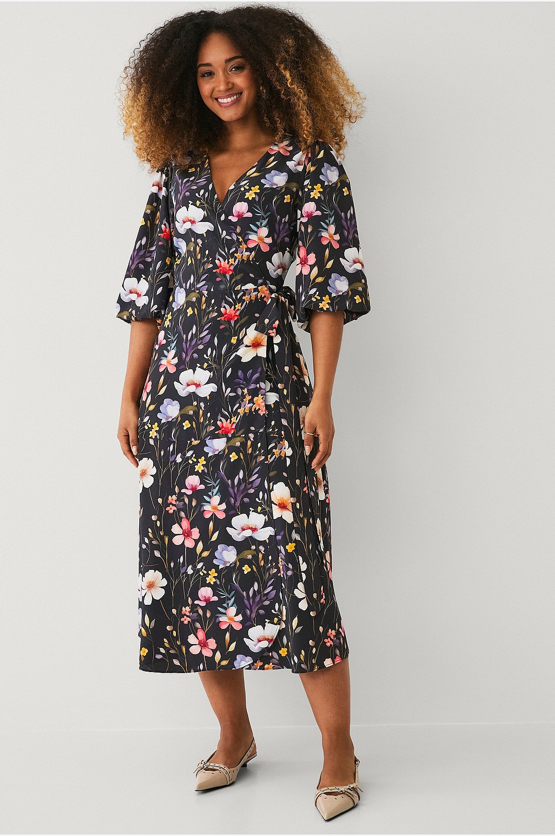 Kärleksdrobe kvinnor midi klänning V-hals kort puffärm Wrap skjorta midja blommig tryck passform och flare bröllop gäst svart 40, svart, 40