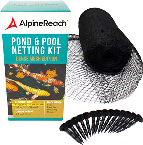 AlpineReach Koi Pond Netting Kit 4,5 m x 4,5 m svart tungt vävt fint nätskydd för löv – skyddar koi-fisk från blå häger fåglar katter rovdjur UV-skydd – återanvändbara och insatser ingår