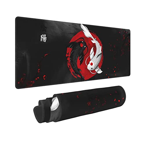 Japansk yin och Yang Koi karp fisk svart röd musmatta XL utökad skrivbordsmatta, halkfri gummibas sydd kant spel pc skrivbord stor musmatta, 80 x 30 cm