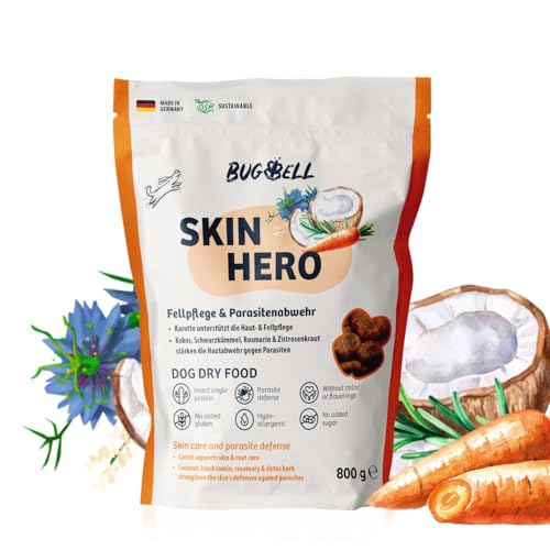 BugBell 800 g SkinHero – premium torrfoder med insekter – allergivänligt känsligt foder för hundar, pälsvård och parasitskydd med svart kummin, hundfoder torrt med kokosolja och cistrosört