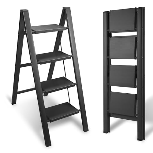Joparri Aluminium trappstege, 4 stegs stegpall, fällbar aluminiumstege, halkfri ståstege, liten och kompakt, kan belastas upp till 150 kg för hushåll/kontor/bärbar lagerhylla (svart)