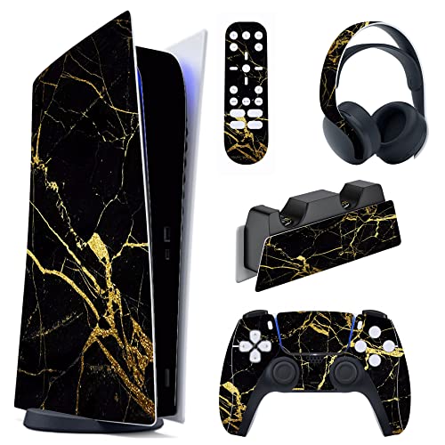 PlayVital Klistermärke för ps5-konsol Disc Edition,Anti-repor Skydds Klistermärken för ps5,Hud Skins Stickers för ps5-kontroll& Laddningsstation&Headset&Fjärrkontroll-Svart Och Guld Marmor Effekt