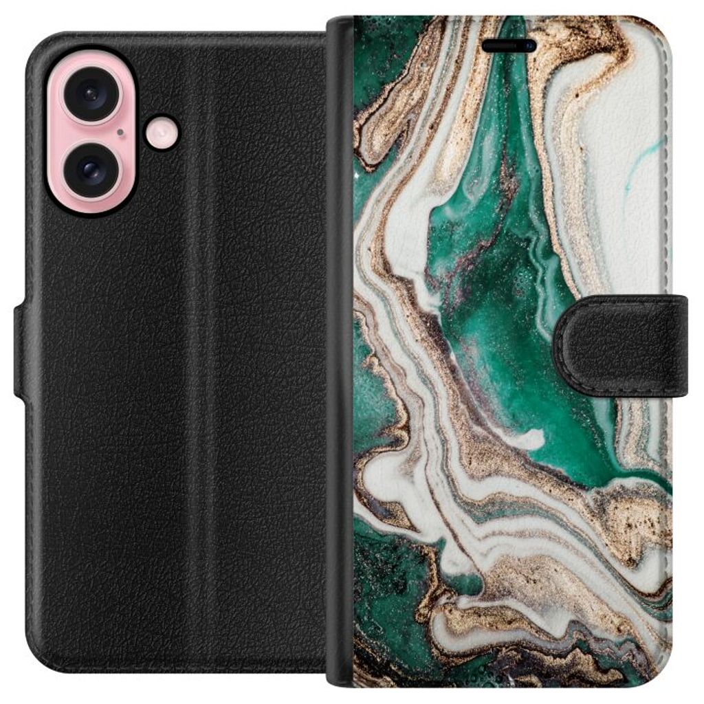 Apple iPhone 16 Svart Plånboksfodral Grön / Guld marmor