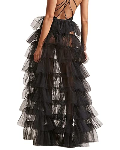 Acrawnni Dam tyll tutu långa kjolar bröllopsfest cocktail bal bandage nät maxikjol överlägg lång brud, X-svart, one size