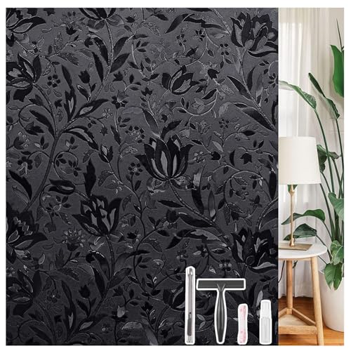 LEMON CLOUD fönsterfilm ogenomskinlig självhäftande, svart mörkläggningsgardin statisk no-Glue insynsskydd, anti-UV solskyddsfilm för sovrum, svart tulpan (44,5 x 200 cm med verktyg)