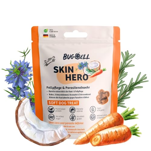 BugBell spannmålsfritt hundgodis med funktion 60 g, för pälsvård och parasitförsvar, med morot, svart kumminolja, kokosolja, cistrosört och rosmarinpulver
