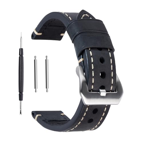 Berfine Svart 24 mm äkta läder armbandsur klockarmband olja solbränna vintage klockarmband för män med rostfritt spänne