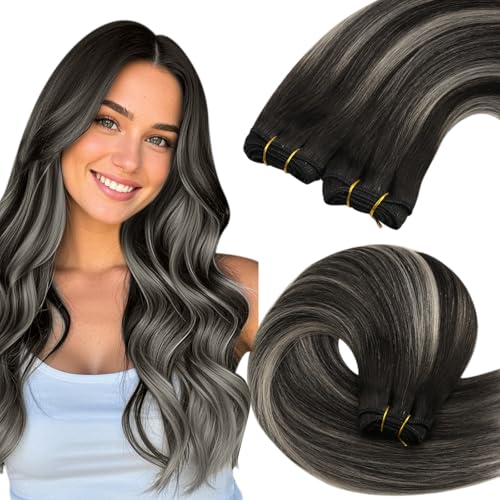 YoungSee Hårsträngar av äkta hår, ombre-strängar, förlängningar, svart, ombre, silver, väft, extensions, balayage, hårsträngar som sys in, långt 100 g, #1B/1B