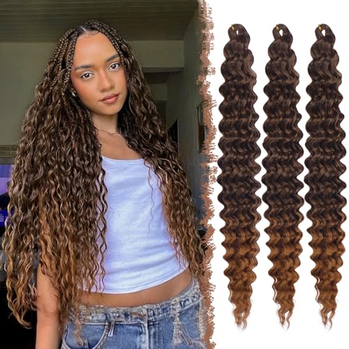 FESHFEN Ocean Wave Virkat Hårförlängningar - 3 Stycken Vågiga Boho Virkade Flätor Vågigt Hår Virka Flätning Förlängning Syntetisk Hårförlängning Hårstycke för Kvinnor, 55 cm Ombre Svart/Auburn