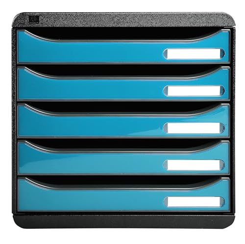 Exacompta - Ref 3097282D - BIG BOX PLUS - 5-facks piedestal för A4+ dokument - Utvändiga mått: Djup 34,7 x Bredd 27,8 x Höjd 27,1cm - Svart/Turkos glansig blå