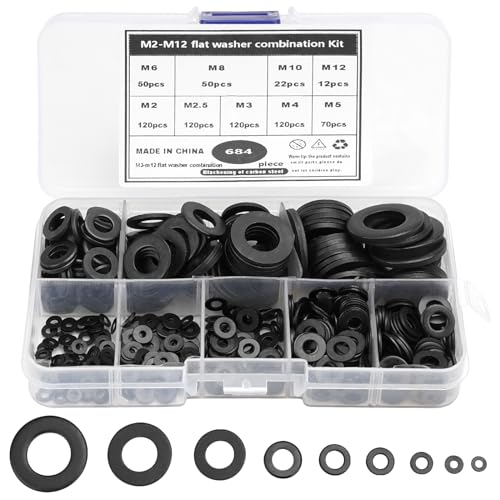 684 stycken platta brickor, 9 storlekar brickor, set med 1 plastlåda, M2 M2,5 M3 M4 M5 M6 M8 M10 M12 brickor kolstål för mekaniska industrifästen, svart