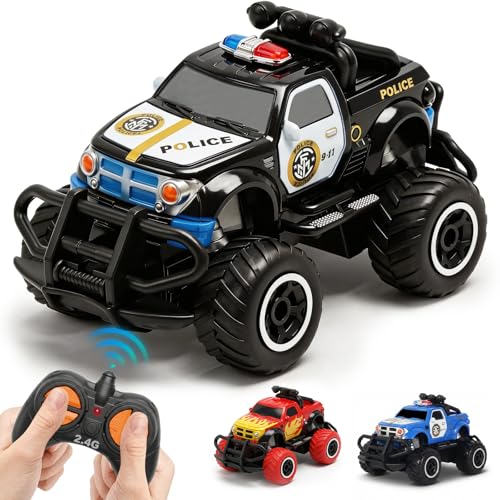 Pup Go polisbil fjärrstyrd med ljus för barn 3–9 år, robust polisbil leksak småbarn, mini RC bil monstertruck offroad inomhus utomhus, jul födelsedagspresent pojke, svart