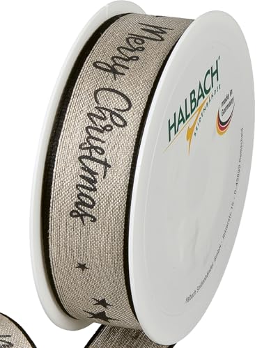 Halbach Sidenband premium presentband jul av linne | bredd 25 mm längd 15 m | julband med tråd för presenter och julgran | Tillverkad i Tyskland, färg: natur/svart