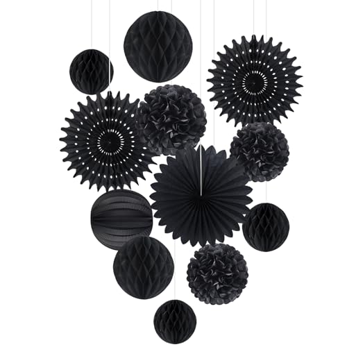 Easy Joy dekoration svart papper pom pom, svart födelsedagsdekoration, rip 20-talsdekoration, krimiddag dekoration rosetter lampion silkespapper, bikakebollar, fest, dekoration för bordsdekoration