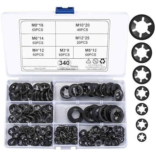 340-delars Säkerhetsskivor, Starlock Brickor, Inre Tand Snabbspärr, Spärrringssnap Sortimentssats - M3/M4/M5/M6/M8/M10/M12, Svart
