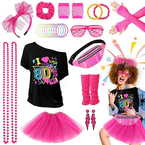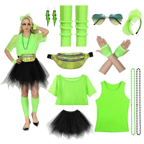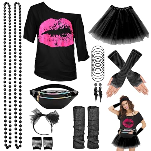 Grantop 28 st 80-tals 90-tals outfit damset, 80-tals klädkostym, t-shirt, tyllkjol, magväska, örhängen, näthandskar, 80-tals retro festtillbehör, kostym 80-tals dam karneval fest