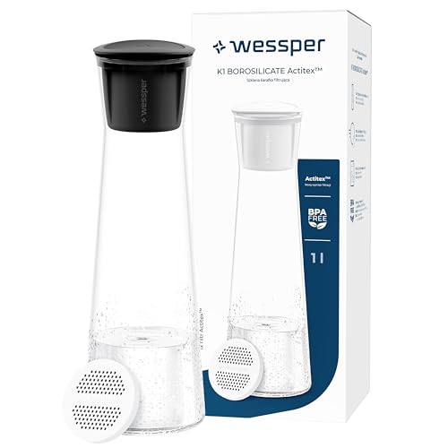 Wessper Glasfilterkaraff, 1 liter, vattenkanna med Actitex Disc filterpatron, glasvattenkanna med lock för vatten och kalla drycker, BPA-fri - svart