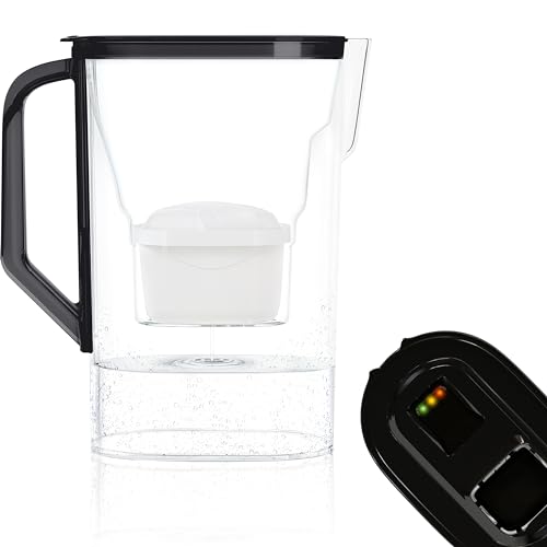 Wessper Vattenfilterkanna med LED-display 3 L, glasvattenkanna med aktivt kolfilter, vattenkanna med vattenfilterpatroner för dricksvatten BPA-fri svart