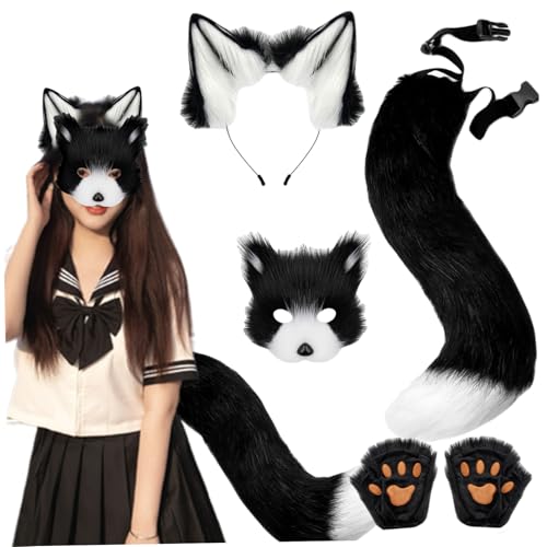 Therian Gear Fox kostymset, falska rävöron och svans, therian-tassar, och mask för vuxna och barn, rollspel, fest, vit svart fin klänning och tillbehör