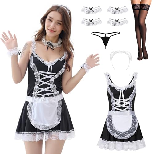 YushengTai Svart vit magisk klänning av spets, maid kostym, sexig, klassisk magisk outfit hängslen klänning, Maid Cosplay med pannband, för bröllopsnatt, smekmånad, sexig cosplay, 2XL
