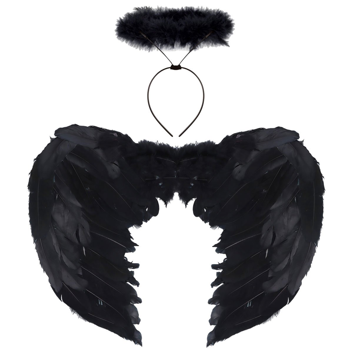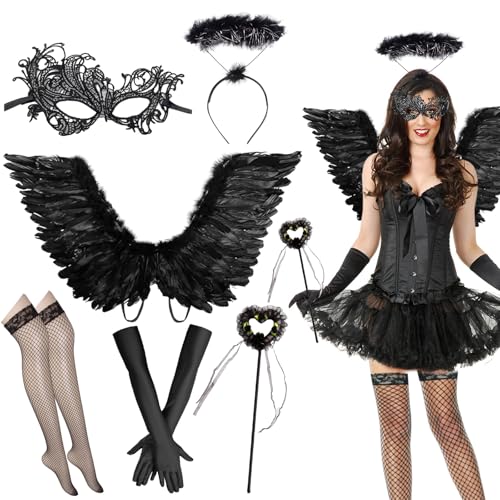 Svarta änglavingar, ängladräkt för kvinnor, svart ängladräkt med gloria och trollstav, halloweendräkt med svarta änglavingar för kvinnor, änglavingar för halloween, karneval, cosplayfest