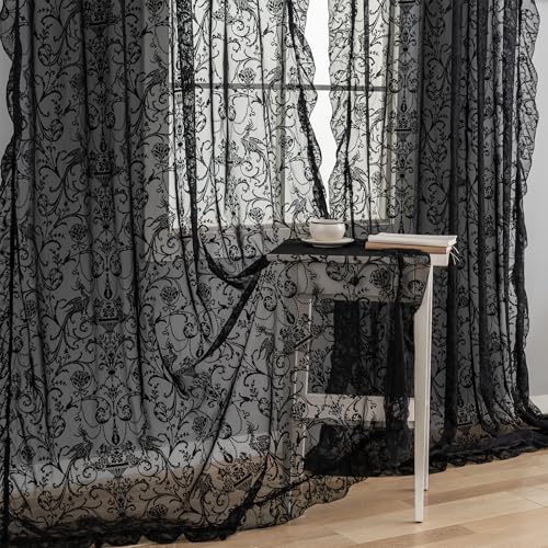 TUDECO Svarta genomskinliga gardiner 213 cm långa – shabby chic stickade blommiga spetsgardiner integritet gotiska/häxa mörka fönstergardiner för vardagsrum stång ficka fransk dekor 1 par, 145 x 213