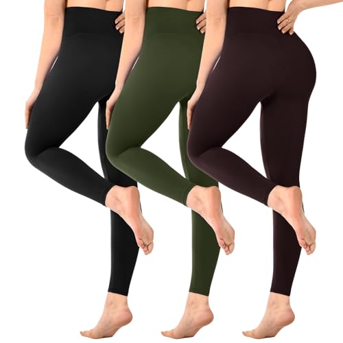 SINOPHANT 3-pack leggings dam hög midja, ogenomskinliga svarta leggings för gym yoga sport, 3-pack svart/armé grön/brun, L/XL