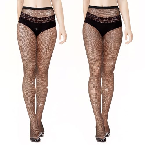 Abeillo 2 par fisknätsstrumpor för kvinnor, strass, stretchiga nätstrumpbyxor, hög midja, fisknät, svarta leggings, glittrande kläder för fester, bal, halloween, Svart, L