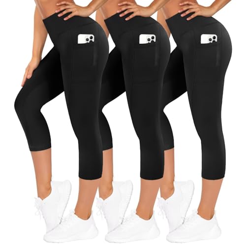 TNNZEET 3-pack caprileggings dam hög midja svarta leggings ogenomskinliga för sport gym, Fickor-svart/svart, S/M