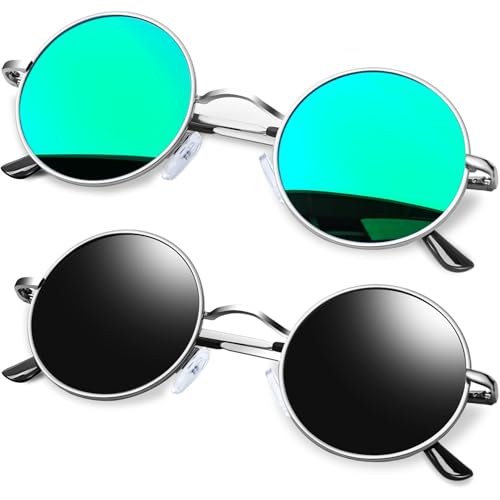 KANASTAL 2 Gröna Polariserade Solglasögon Herr Dam Runda Speglade Sol Glasögon Män Kvinnor Green Round Polarized Sunglasses Men Retro Hippie Steampunk Cosplay UV400 - Silverbågar Svarta Linser + Gröna