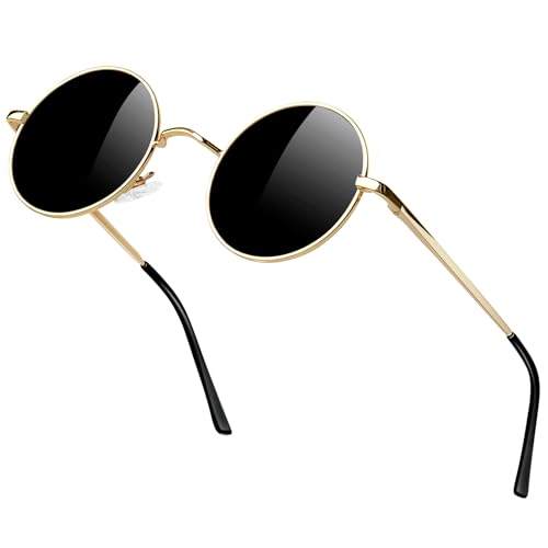 KANASTAL Svart Solglasögon Polariserade Herr Dam Runda Kvinnor Sol Glasögon Retro Hippie Steampunk Halloween Cosplay Gold Black Round Polarized Sunglasses Men Women UV400 - Svarta Linser Guldbåge