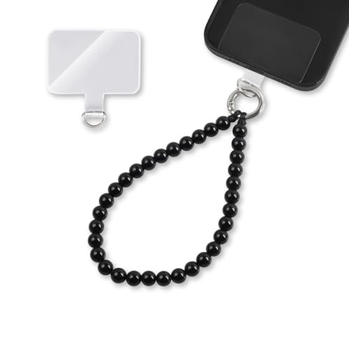 Mobiltelefonkedja med svarta pärlor kort - Universalarmband för mobiltelefon inkl. patch för varje mobilskal | Nyckelband för mobiltelefon (längd 24cm)