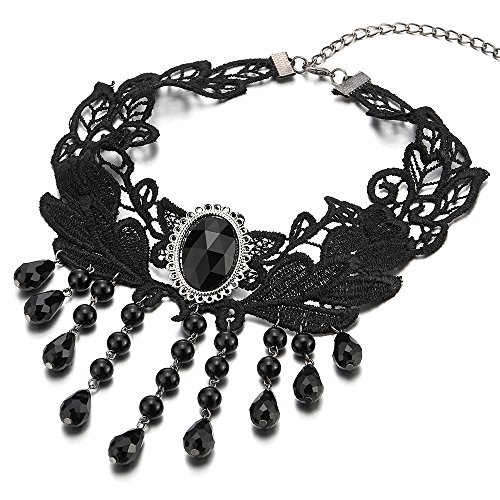 COOLSTEELANDBEYOND Gotisk viktoriansk nostalgisk svart spets choker-halsband med dinglande svarta pärlor berlocker länkkedja, Ej tillämpbar