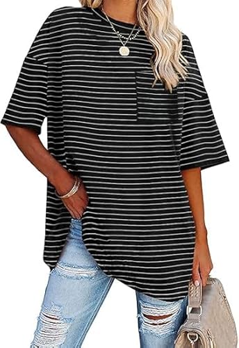 Ebifin Dam oversize t-shirt rund hals kortärmade toppar casual lös basic sommar t-shirts skjortor blus., Svarta ränder, XXL