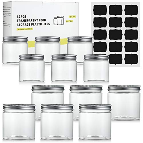 LSAIFATER 12 st små genomskinliga BPA-fria matförvaringsburkar i plast med aluminiumskruvtopp, slime behållare (6 st x 350 ml/12 uns, 6 st x 150 ml/55 uns, 15 st svarta tavlan-etiketter)